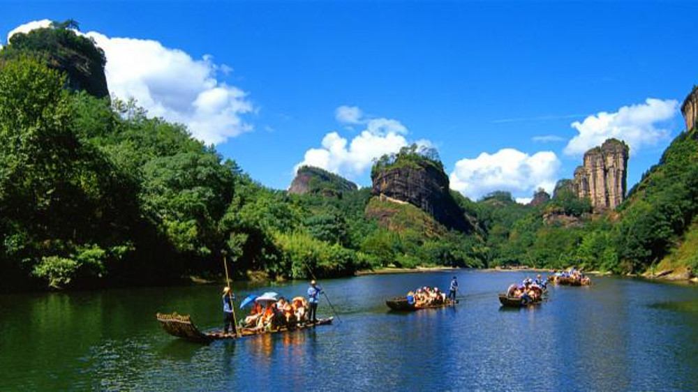 上午游览有“武夷第一胜地”美称的云窝-天游峰景区,时间约2-3小时,具体包含御茶园、双乳峰、云窝、晒布岩、茶洞、天游峰、隐屏峰、天游阁、中正公园等景点;下午参与“中国最美的溪流”九曲溪的竹筏漂流,时间约2小时。在这一过程中你可以沿途观赏纱帽岩、上下水龟、武夷悬棺,玉女峰等30多个景点;上岸后游览武夷山文化底蕴最丰富的武夷宫景区,时间约30分钟:仿宋古街、武夷山博物馆、武夷山古代名人馆;后观赏茶艺表演,免费品武夷岩茶;晚上观看由张艺谋导演执导的《印象大红袍》大型山水实景演出。