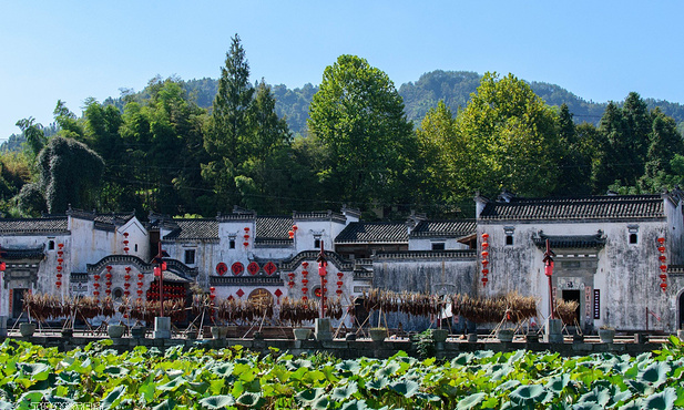 适合季节秋日里的徽派村落,周边漫山遍野的乌桕树呈现绿、黄、红的斑斓色彩,田地里白墙黑瓦的小村升起袅袅炊烟,景色如油画般优美。
