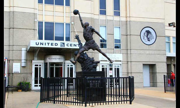 最后来到芝加哥联合中心球馆(United Center),它是国家冰上曲棍球联盟芝加哥黑鹰队和NBA芝加哥公牛队的主场,乔丹像位于体育馆的冬眠,美国联合航空公司每年支付180万美元,直到2014年一直享有体育馆的冠名权。