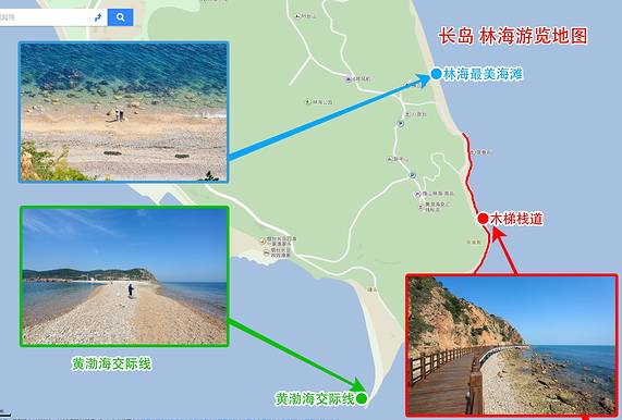 南岛林海是重点,风景很好,6号风机下到山下,有一个球石海滩,水质很清澈,还可以沿着海边的木梯栈道,一路看海徒步走到黄渤海交际线、在长山尾的水质尤其的好,海滩上有很多很大的球石,浅海处翻开球石,就会看到小螃蟹、小鱼。