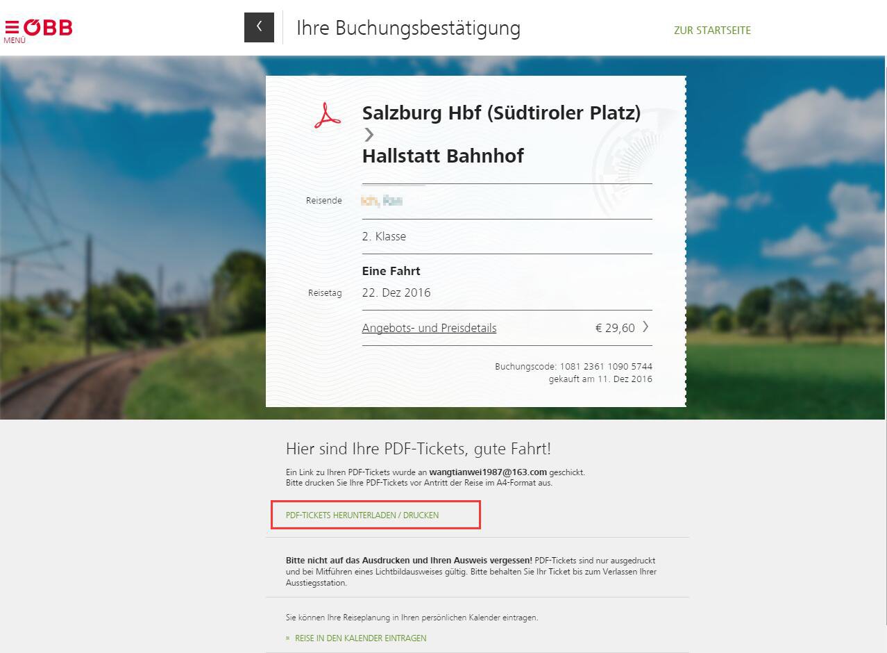 网上购票如何取票? 可凭取票码在自助购票及上取票,也可打印电子车票。 注意! 注意! 注意! 一旦选额了打印电子车票,那么取票码将失效,即无法在自助取票机上取出车票!不要问我怎么知道的! 购票成功后,您的邮箱会收到一封订单确认邮件,标题为“ÖBB Buchungsbestätigung+订单号“;与一封标明了取票码的邮件,标题为“ÖBB Pick-up Code for Your Order +订单号” 点击订单确认邮件中的“Details”会打开OBB官网并跳转到车票信息界面,如图: