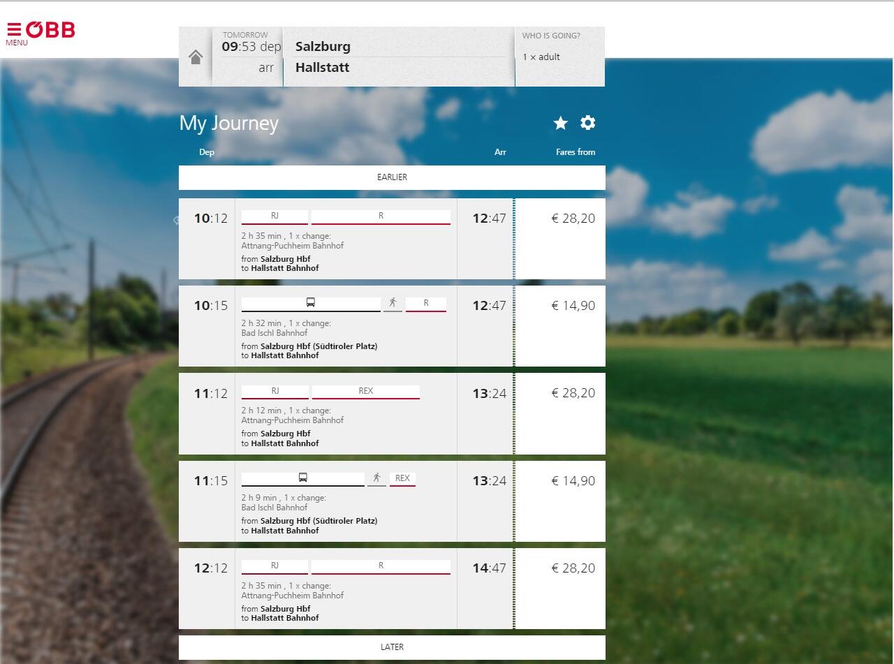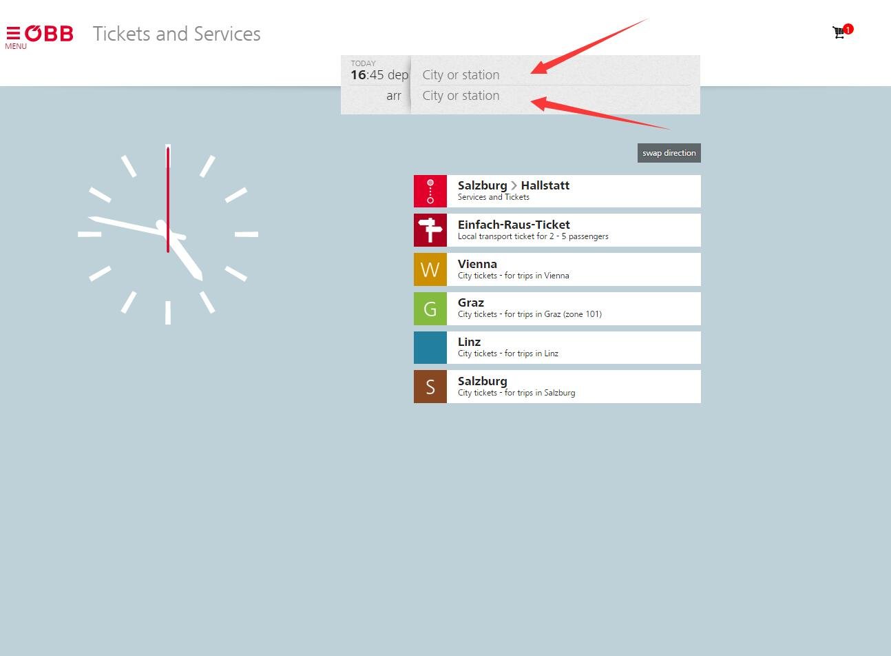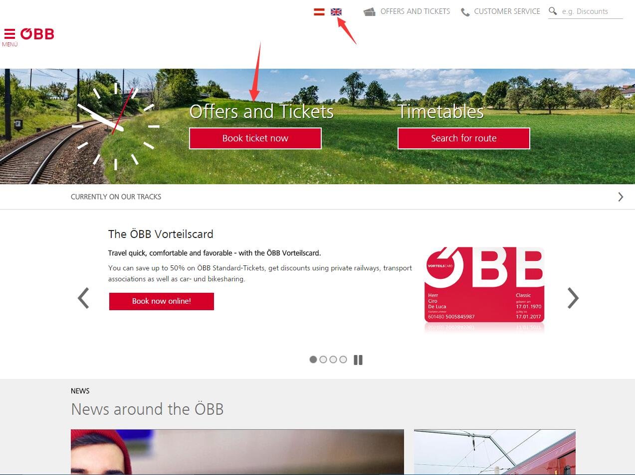 单独购票,怎么买? 三种方法: 奥铁或欧铁官网:可选择电子票,或凭订单信息到奥地利自取 国内代理商(携程、途牛等OTA可查询购买):可快递可自取 当地购票:火车站窗口或自动售票机均可购票 以下为通过奥铁官网的购票步骤,以萨尔茨堡(Salzburg)到哈尔施塔特(Hallstatt)为例。 奥铁官网:www.oebb.at 点击英国国旗可切换为英语 点击Offers and Tickets可进入购票页面 点击左上角可进入左侧菜单栏