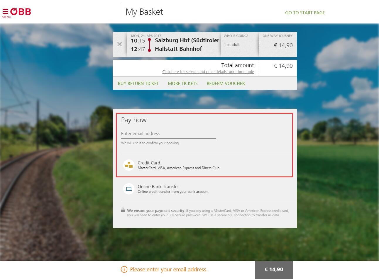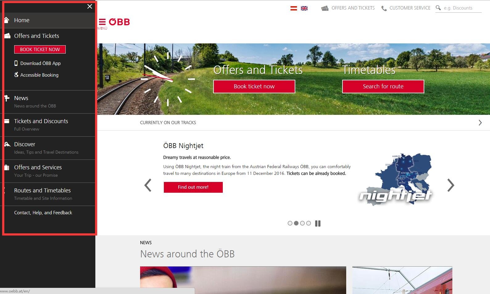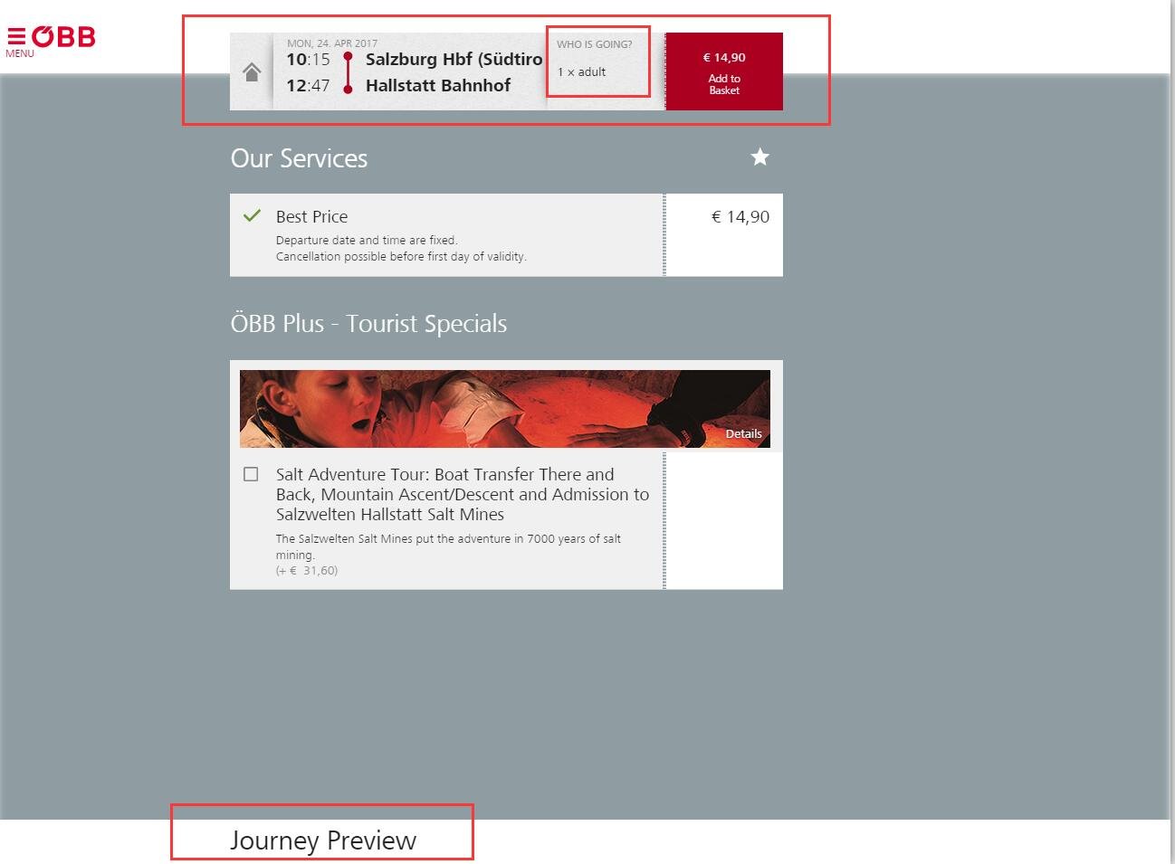 单独购票,怎么买? 三种方法: 奥铁或欧铁官网:可选择电子票,或凭订单信息到奥地利自取 国内代理商(携程、途牛等OTA可查询购买):可快递可自取 当地购票:火车站窗口或自动售票机均可购票 以下为通过奥铁官网的购票步骤,以萨尔茨堡(Salzburg)到哈尔施塔特(Hallstatt)为例。 奥铁官网:www.oebb.at 点击英国国旗可切换为英语 点击Offers and Tickets可进入购票页面 点击左上角可进入左侧菜单栏