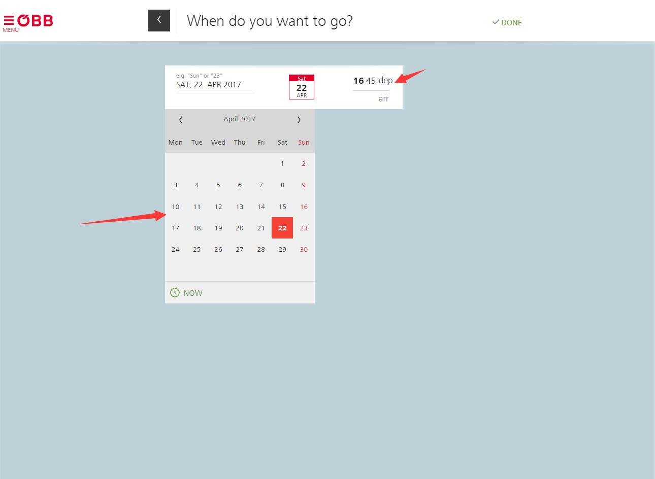 点击出发地/目的地左侧的时间,进入选择时间界面,可选择出发或到达时间