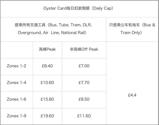 2.市内交通 -Oyster Card(伦敦地铁一卡通) Oyster card!Oyster card是伦敦电子交通卡,不仅可以刷地铁,刷公交车,还可以刷电车Trams,伦敦码头区轻轨(DLR),甚至伦敦1-9区之内的火车!使用方法和国内的地铁公交卡一样,入站、出站都刷卡,忘刷会多扣钱。在所有的伦敦地铁站都可以购买Oyster Card,而且随时充值随时走,非常方便。 *优惠攻略 购买地铁成人单程票是£4.7,而使用Oyster Card单次只要£2.2,省一半还多。 刷Oyster Card有Daily Cap(每日限额),在每天的24小时内(从凌晨4:30到次日凌晨4:30),搭乘交通工具的费用会用上限,到一定数额会封顶。具体的封顶数额计算方式有以下两种: 1.Bus & Tram journeys only(只搭乘公车和电车):使用Oyster Card,每天只搭乘公车和电车,不混合搭乘其他交通工具,最多扣£4.4。 2.搭乘所有交通工具的限额(Bus, Tube, Tram, DLR, Overground, Air Line, National Rail): 分为在Peak(高峰时间:周一到周五 凌晨4:30到9:30)搭乘和Off Peak(除Peak以外所有的时间)