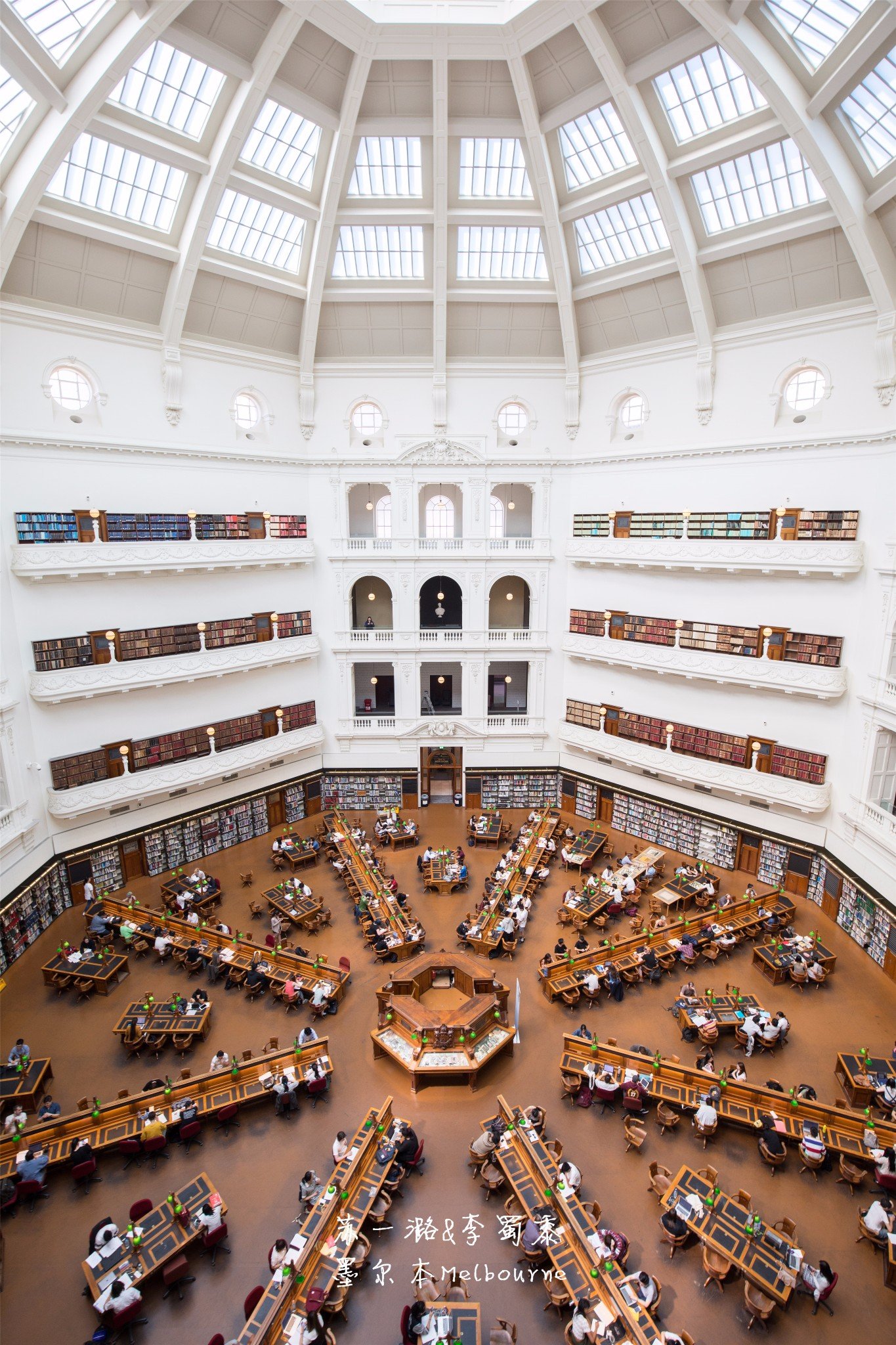 墨尔本维多利亚州立图书馆State Library of Victoria,想必很多人看过这张阅览室的照片。高耸明亮的圆形穹顶和八角形的格局,配上木质桌椅和绿色复古台灯,不管怎么拍都好看。现场去看更震撼,是那种由内而外暴击的感受,恨不得留下来学习,强烈推荐。