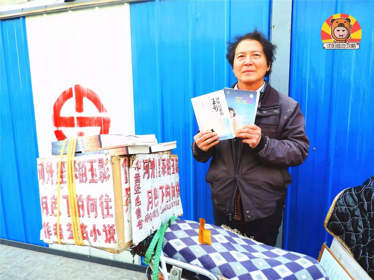 过了马路想要去接着寻找美味,看到了这位顶着寒风卖书的街头作家。