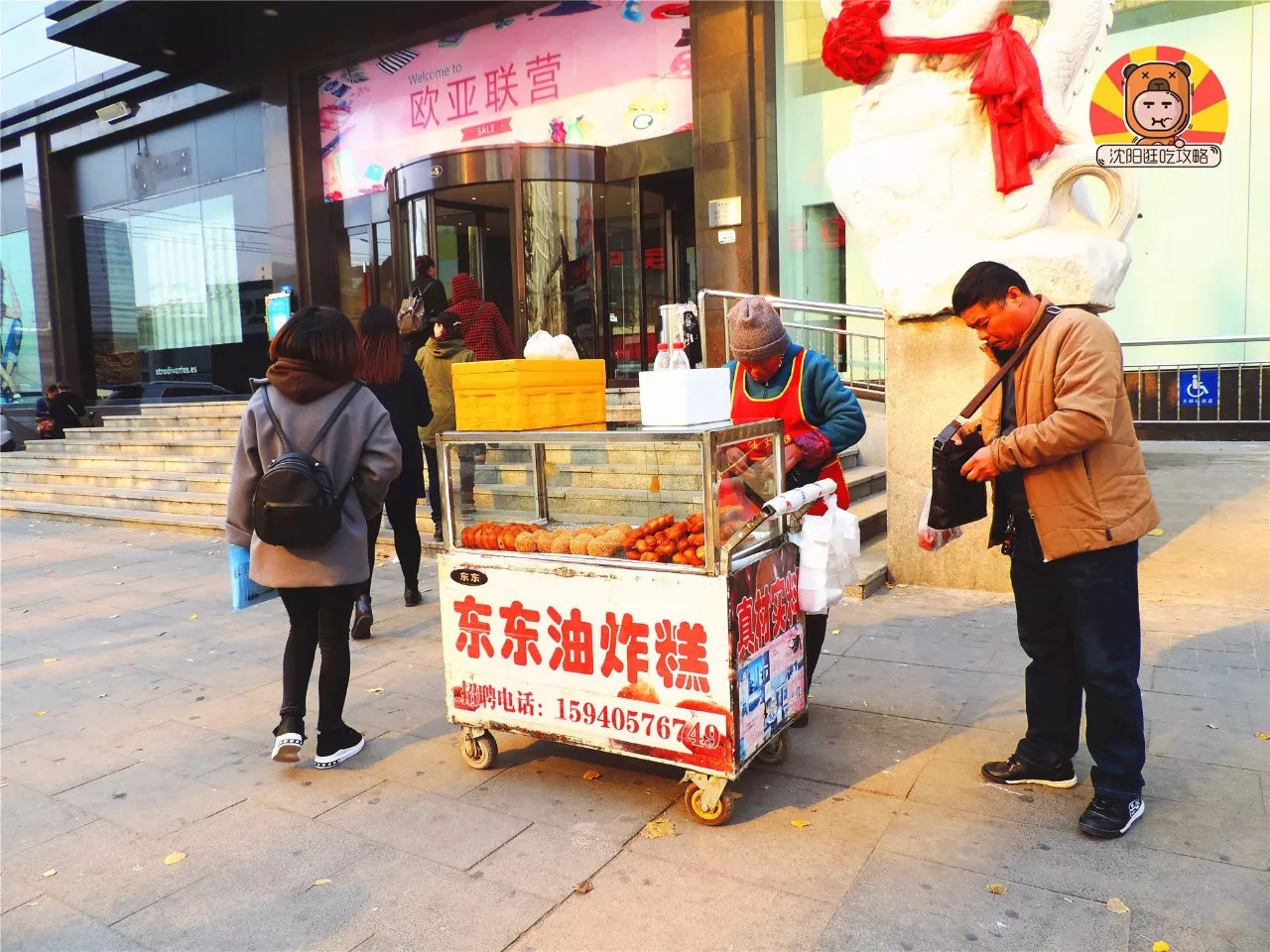 在联营正门前,有个老奶奶在推车买炸糕~