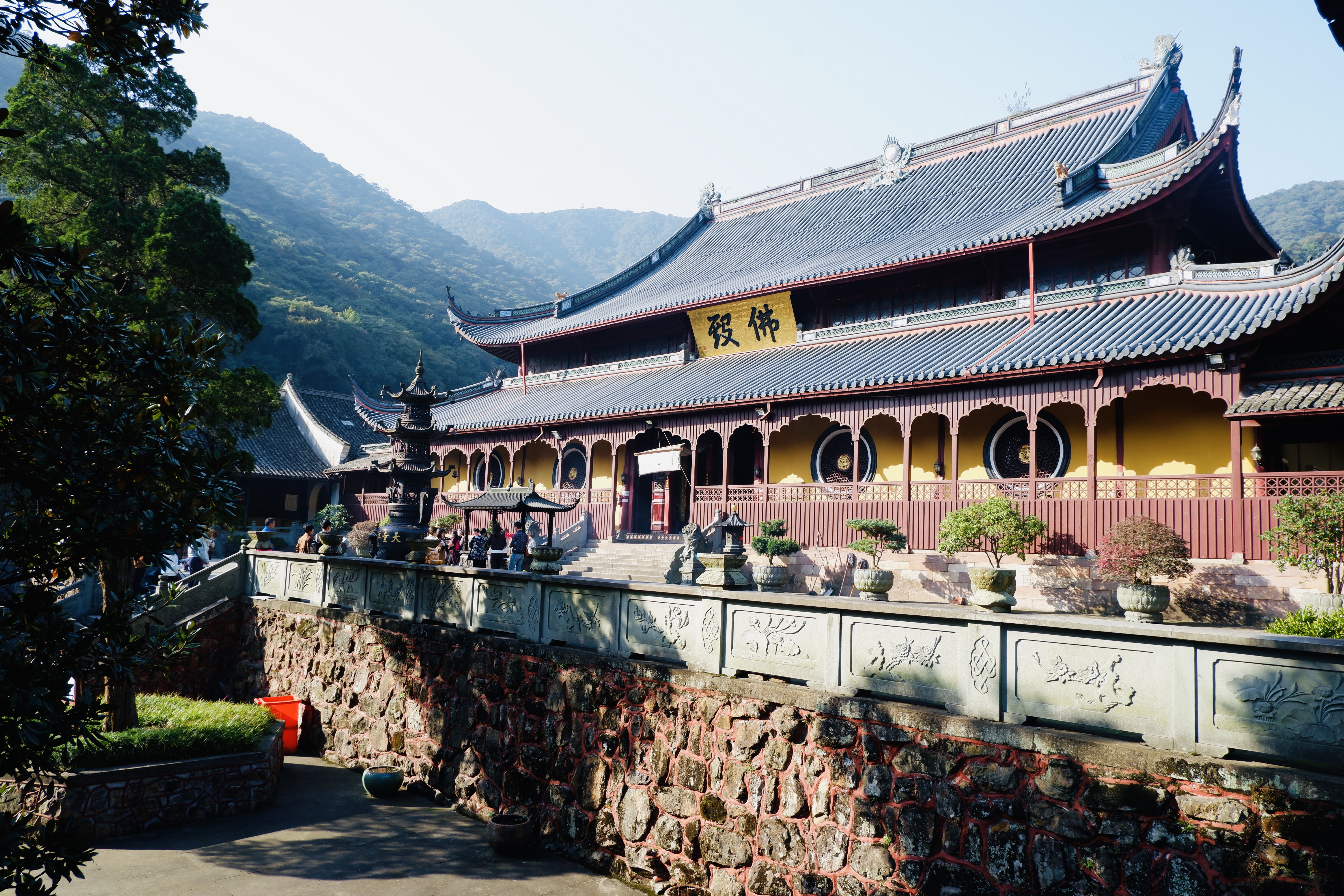 Day 2 千年古刹走一波 1, 第一站 群山环抱的天童寺 把天童寺作为第一站,主要是因为他比第二站的阿育王寺更远,本着不走回头路的想法,先去远的天童寺,再去近的阿育王寺,这样一条线上正好。 天童禅寺开创于西晋永康元年(公元300年),历史1700多年,真的是千年古刹了,他是佛教禅宗五大名刹之一,号称为“东南佛国”,位于太白山麓,传说是僧人义兴云游到此,后结茅开山,建造精舍;日夜诵读经文感动了玉皇大帝,故命太白金星化为一童子从旁协助他修建此庙宇,修建成功以后童子归天,故命名为“天童”。 “群峰抱一寺,一寺镇群峰” 天童寺四周群山环抱,重张叠翠,古松参天,又有十大胜景:深径回松、凤岗修竹、双池印景、西涧分钟、平台铺月、玲珑天凿、太白生云、东谷秋红、南山晚翠、清关喷雪。这里不仅仅可以虔诚的礼佛还可以一睹山中风景,真的超级适合早上过来,早一些出发。 宁波天童寺旅行小tips:门票免费,建议游览时间:2-3小时;开放时间:8:00-18:30;公交车:162路;距离宁波市区30公里,公车在1个半小时左右,推荐先坐到地铁1号线宝幢站,再打车或者公交车(12公里);推荐在太白饭馆吃个午饭或者买点小吃,从山脚走到寺庙的路上有很多小吃,烤番薯很好吃。