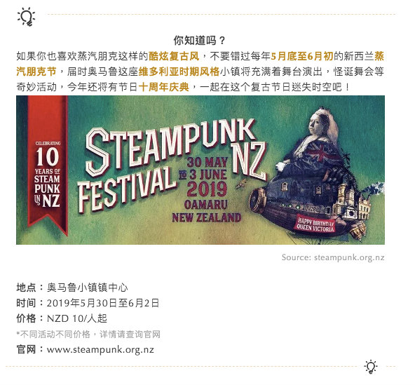 *儿童票年龄为16岁以下 **家庭套票为2名成人+2名儿童 联系电话: +64 27 778 6547 官网:www.steampunkoamaru.co.nz