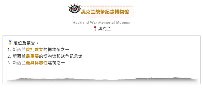 👀原图来源于奥克兰博物馆战争纪念馆 地址:The Auckland Domain, Parnell, Auckland 交通:距奥克兰市中心约10分钟车程 开放时间: 博物馆:10:00AM - 5:00PM 遗产图书馆: 周一至周五10:00AM - 3:00PM 周六10:00AM - 5:00PM 周日不开放 博物馆商店:10:00AM - 5:00PM 咖啡馆:10:00AM - 4:00PM 价格: