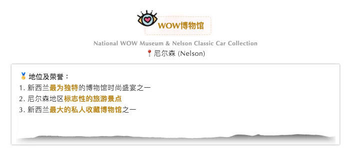 👀原图来源于WOW博物馆可着装艺术展览馆 地址:1 Cadillac Way, Annesbrook, Nelson 交通:距尼尔森市中心约9分钟车程 开放时间: 博物馆/画廊 10:00AM - 5:00PM 咖啡厅 9:30AM - 4:00PM 价格: