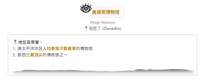 👀原图来源于奥塔哥博物馆Facebook 地址:419 Great King Street, Dunedin 交通:距但尼丁市中心约16分钟步行路程 开放时间:10:00AM - 5:00PM 价格:免费参观 *部分特展需购票进入,具体请查询官网 联系电话: +64 3 474 7474 官网:www.otagomuseum.nz 从古往今,留住时光 新西兰就在这里 守护着这些盛满记忆的“国家宝藏” 和关于这片土地与历史的奇妙故事 来一探究竟,解锁旅行的“新”趣味