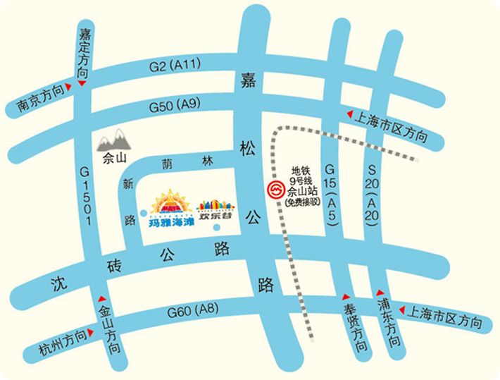 <地铁> 乘坐上海地铁九号线在佘山站下车,过天桥坐欢乐谷免费接驳车五分钟即至上海欢乐谷。打车也很方便哦,基本上只需要付个起步价。 <公交> 乘松江19路、松江19路区间、松重线在欢乐谷站下,步行5分钟即可至上海欢乐谷。 <自驾> 上海市区方向:G50(A9)赵巷出口,沿嘉松公路至沈砖公路再西行百米。 停车场:上海欢乐谷及上海玛雅海滩水公园配套佘山国家旅游度假区停车场共有5000余个停车位。