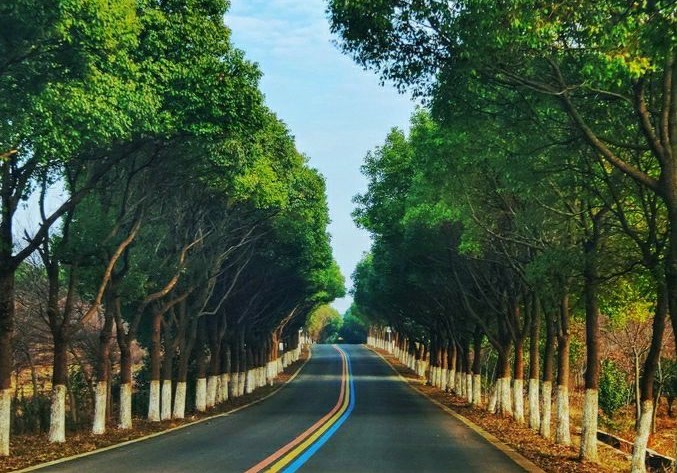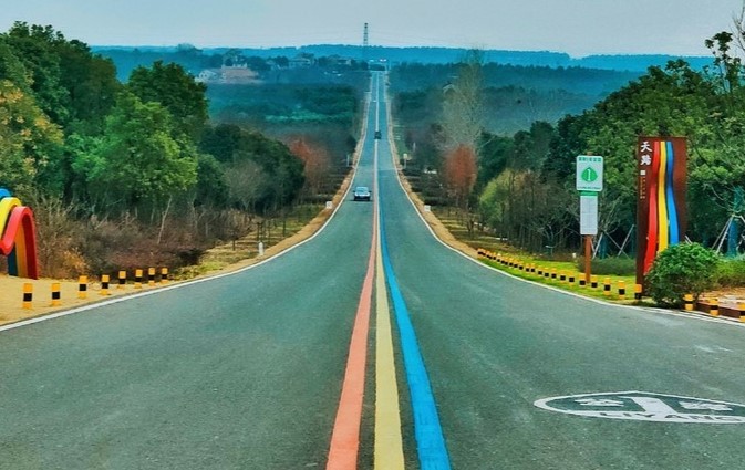 🌈为什么称它为彩虹公路呢? 因为道路的中心线呈现“红黄蓝”三色,连绵不断。溧阳1号公路是首批江苏省旅游风景道,链接每一个小景点。