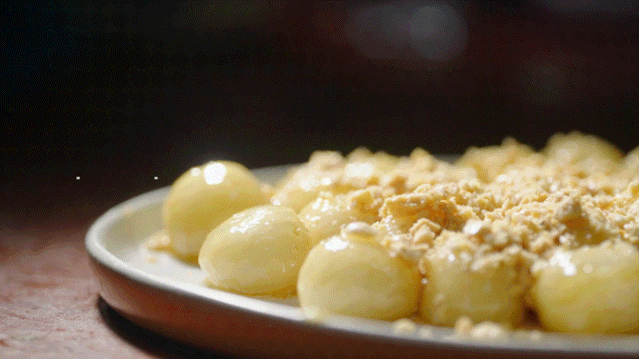 略带焦香的糯米团,与富含油脂香气的花生碎是最好的搭档,水煮后的糯米粉团加入糖浆,不疾不徐地颠炒使其均匀裹满,芬香四溢。