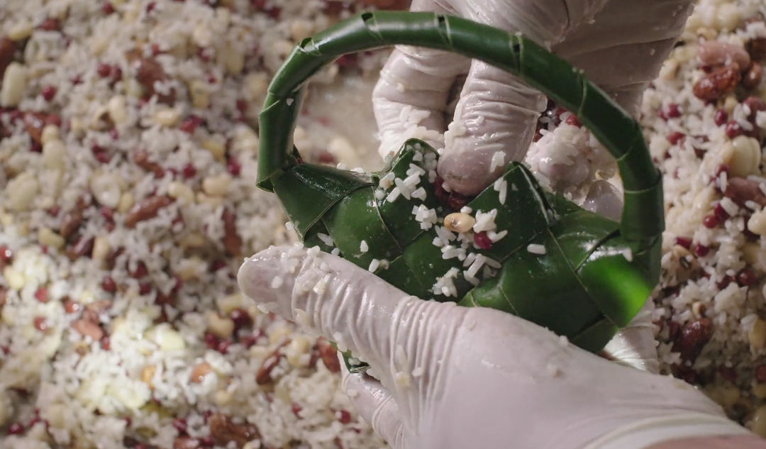 隔壁道滘镇的裹蒸粽同样不会辜负期待,五花腩肉裹满五香粉,搭配脱皮绿豆、咸蛋黄,传统莞草包裹瞬间增添了几分乡愁的情愫。