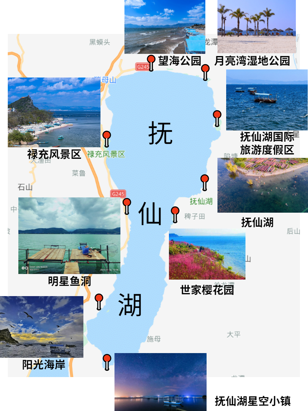 👆抚仙湖的环湖路线图,本条路线围绕着抚仙湖,把大部分热门景点全部包含在内,供大家参考~
