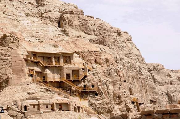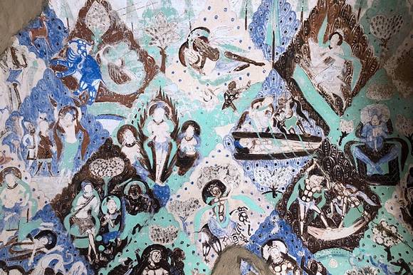 【龟兹古国】 龟兹国又称丘兹,是中国古代西域大国之一。新疆的库车、拜城、新和、沙雅、轮台县一带,都曾是古代西域龟兹国的领地。这里承袭了自印度传来的佛教文明,悬崖峭壁之上的“克孜尔千佛洞”开凿于公元前3世纪,是我国开凿最早的大型佛教石窟,每个菱格中都表现着一个不同的佛本生故事、因缘故事和千佛故事,画面灵动。