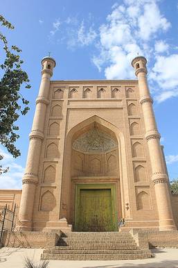 【库车大寺】 老城内还有一“库车大寺”,是新疆第二大清真寺。大寺全部由青砖砌成,高耸的门楼与宣礼塔,凸显出它的庄严挺拔之气。塔柱上的彩雕绘画、穹窿形的楼顶,处处散发着伊斯兰风情。
