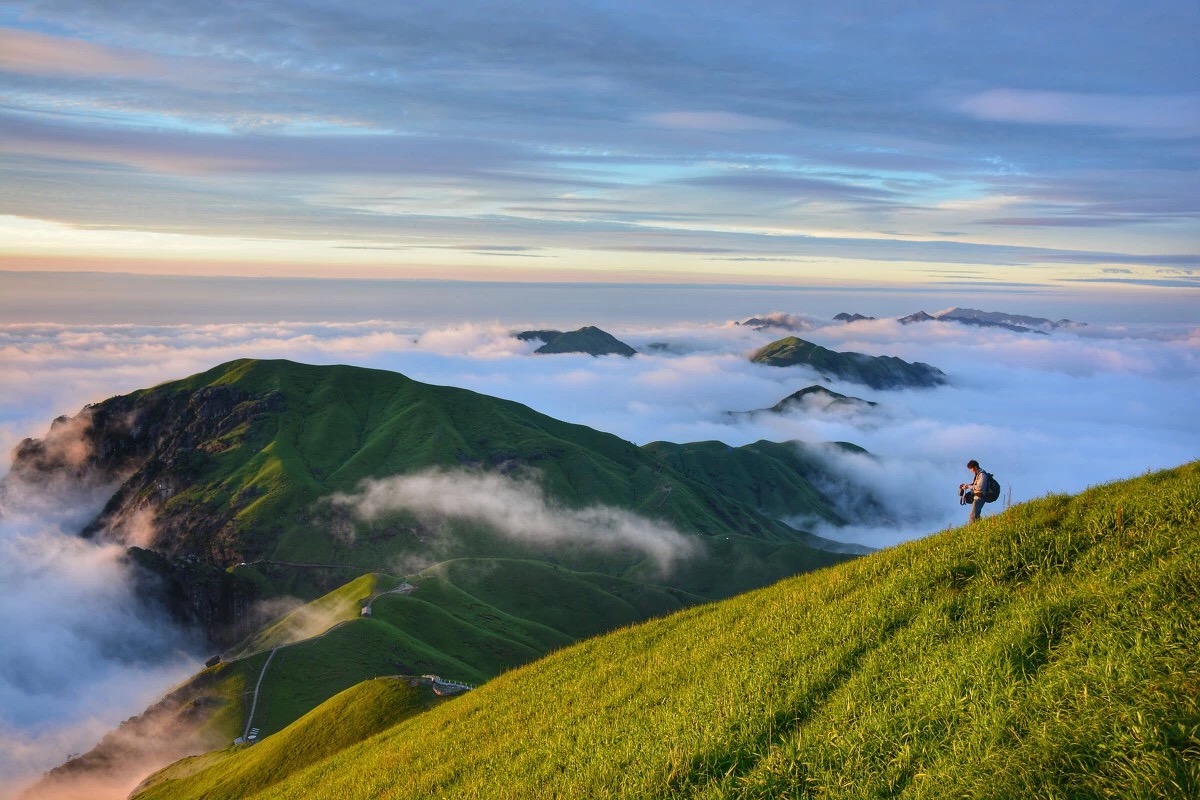 在武功山,一路邂逅绵延的草甸,青翠的山峰,如入草原,如触云端,即使是徒步小白也可以挑战。