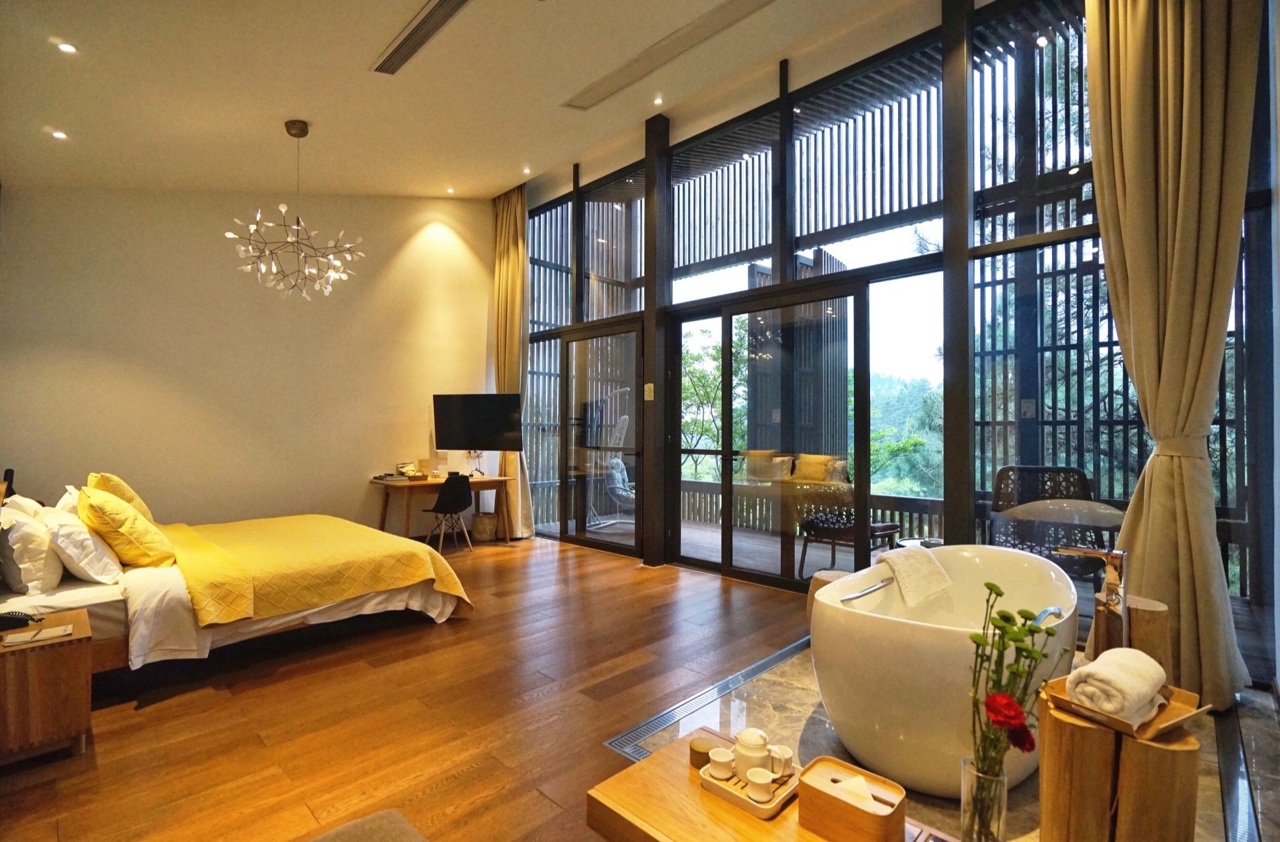 美岕山上的房子都是独栋位于山林间崖壁上的小木屋,有一室的(适合情侣),有多室(适合亲子或朋友相聚),每间房间都有大面的落地窗,开窗见森林,有独立的温泉可享私汤。无边泳池、公共木屋温泉,成片的花海,都是我们向往自然的很多野趣。