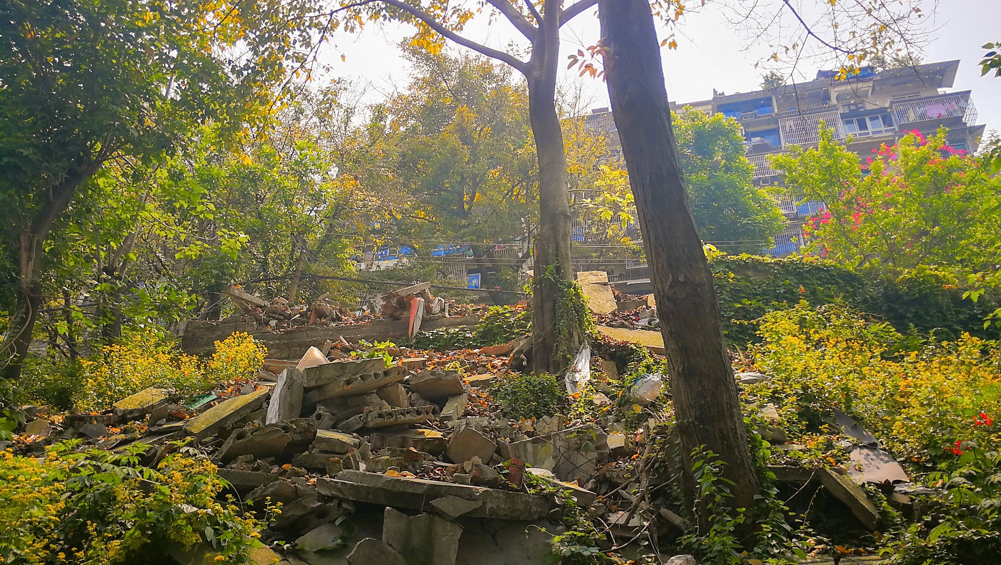 就是这里,想要拍到一张好照片,摄影师不但需要专业的摄影知识,也需要有足够的体力哇,这是轻轨站对面的棚户区改造房旧址,一路沿着废墟爬上来,也需要耗费不小的体力,只为一张完美的照片,给自己点个赞吧,哈哈。