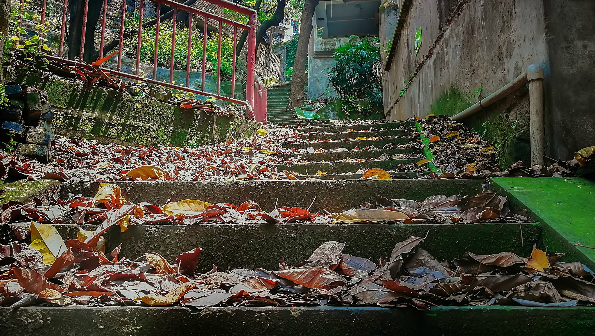 斑驳的楼梯,老旧的栏杆,满地的落叶,鲜有人迹的感觉,却不失味道,走一走这样的小路,也体验一下繁华大都市背后落寞的 重庆 。