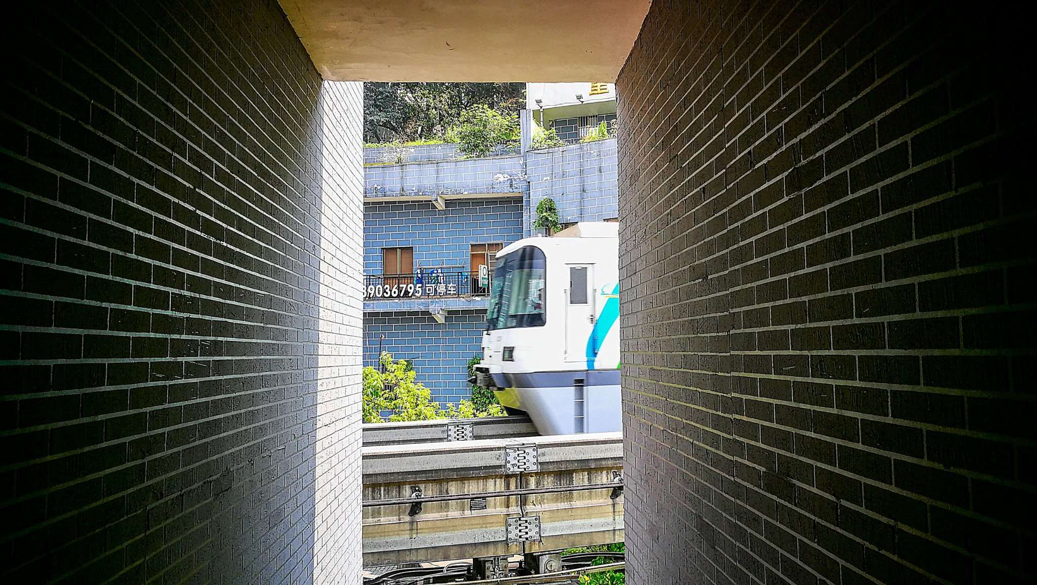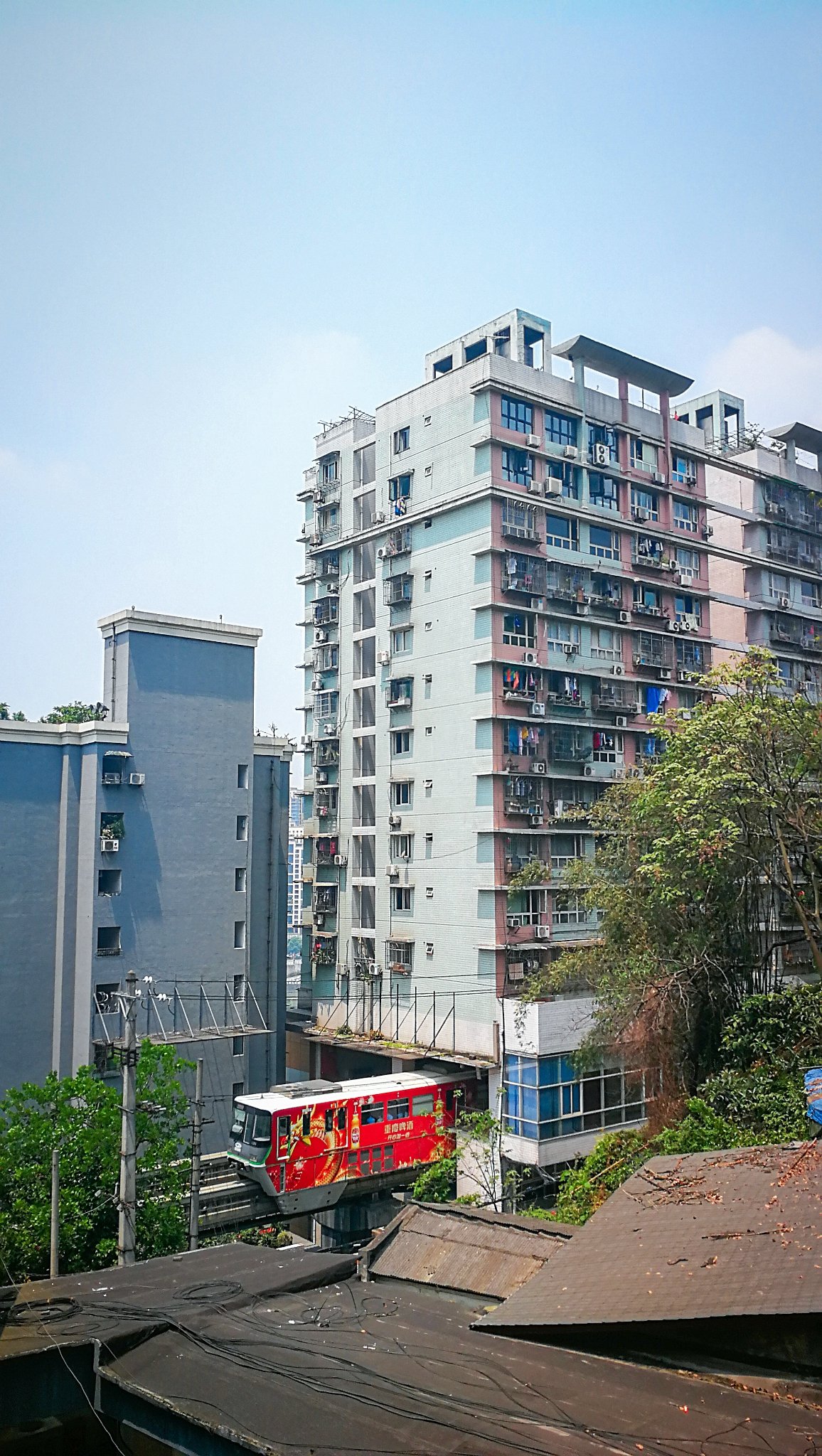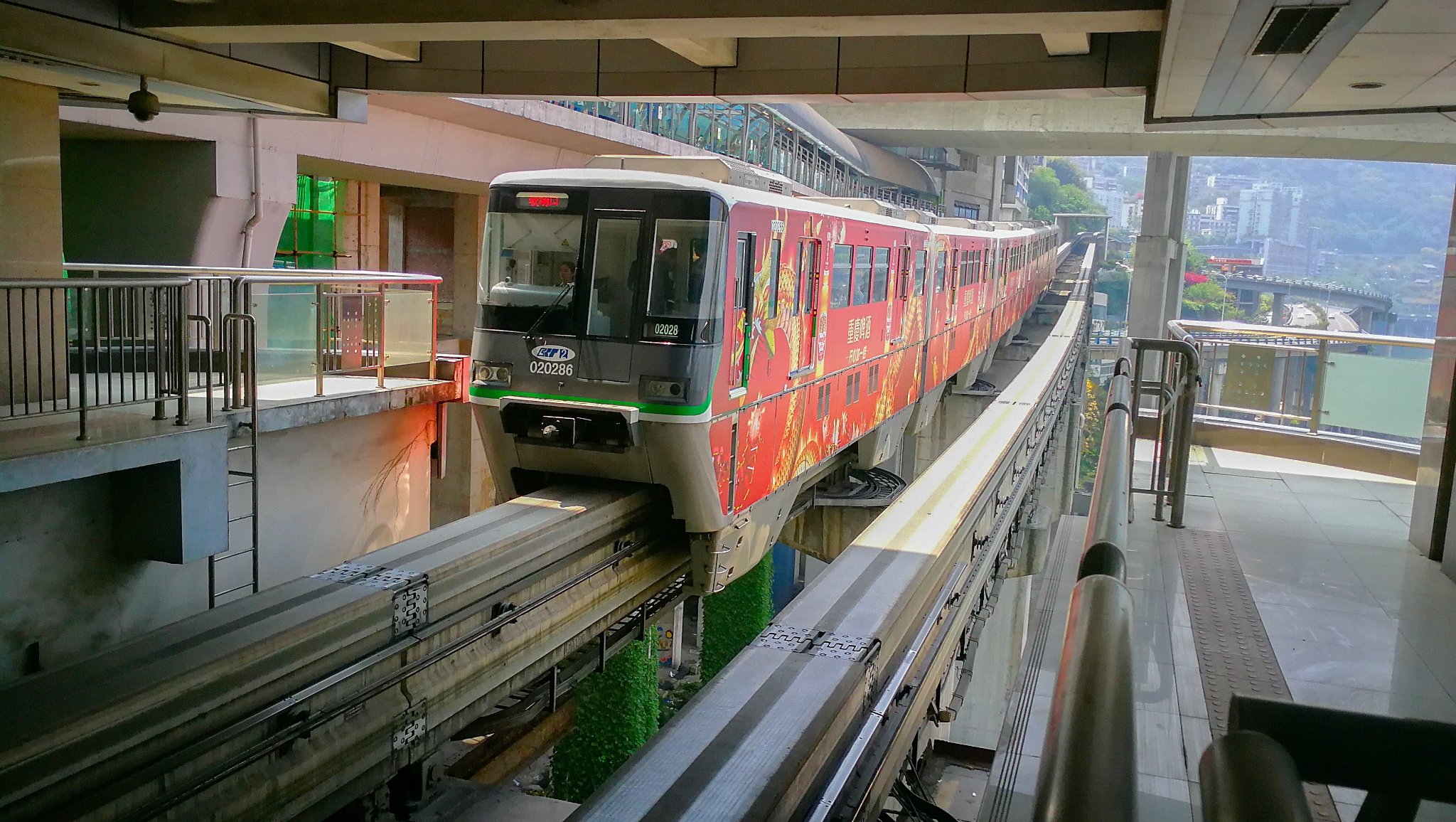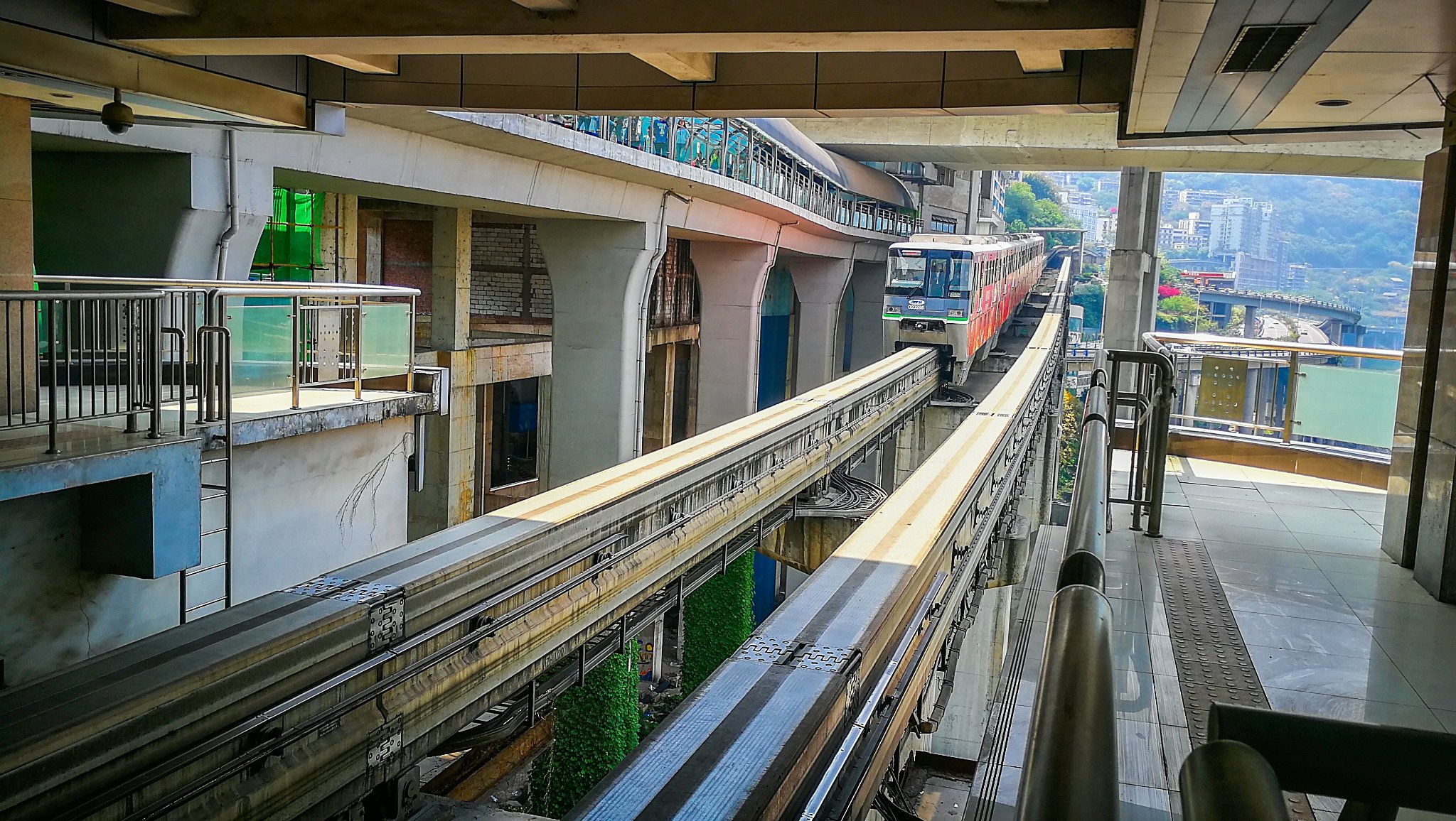 站台在居民楼里,搭乘电梯,来到八楼,候车大厅赫然出现在眼前,等着轻轨,或许你就能看见对面窗户里的人家做饭吃饭的场景,然后等着轻轨呼啸着穿楼而来,真是一次神奇的体验。