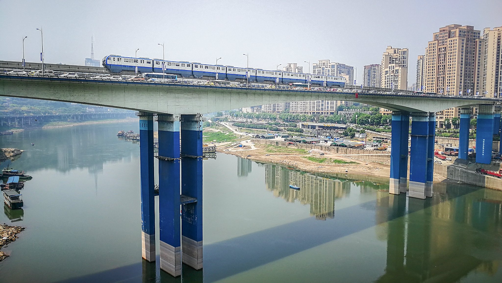 楼宇间,还清晰可见对面居民楼上晾晒的衣物,却有一辆轻轨呼啸而过,真的不能不让人啧啧称奇。 突然也开始好奇起来,到底是先有楼还是先有的轻轨,大概是先有的轨道吧,然后楼依势而建,跨越轻轨,不得不佩服设计师的智慧啊。那又一个问题应运而生,住在这里的居民会不会不堪噪音的骚扰呢,其实不会,大概设计师也想到了这个问题吧, 重庆 轻轨采用跨座式单轨,噪音仅60分贝,即使穿楼而过,也不会影响楼内居民的正常生活。 其实拍李子坝站还有另外一个角度,就是2号线上紧挨着李子坝站的牛角沱站,在这里,可以清晰的看到轻轨沿着山体穿梭并从楼宇间穿越的奇妙景象。 如果想要体验 重庆 独特的轨道交通的话,2号线绝对是一个代表线路。从佛图关站到黄花园站,整个线路都是沿着 江陵 江行驶的,可以看到不错的江景。