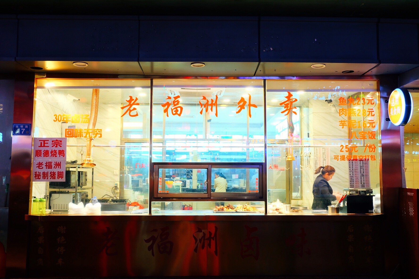美食街靠路中间两排小摊儿,售卖来自全国各地的特色小吃。胖丁沿线看了下,除了本地的鱼丸,肉雁等,看到了小龙虾,甚至我山东的菜煎饼,真是包罗万象~ 除了小摊儿,路边还有许多餐饮店,比如这家【老福州外卖】,百年老店,每天傍晚开始人声鼎沸。