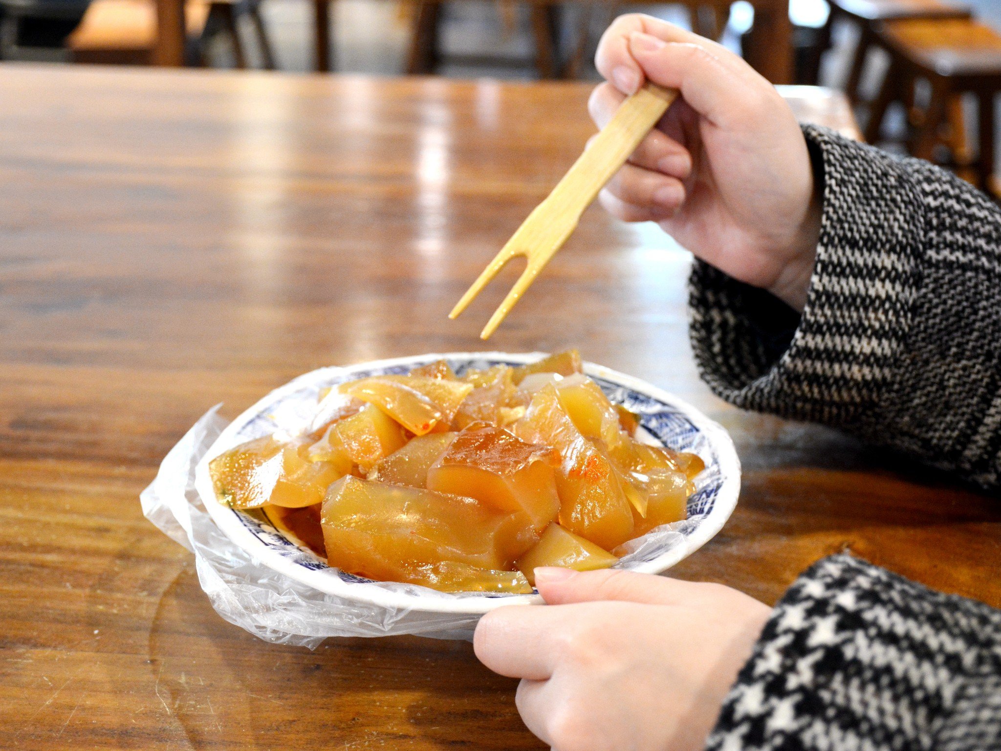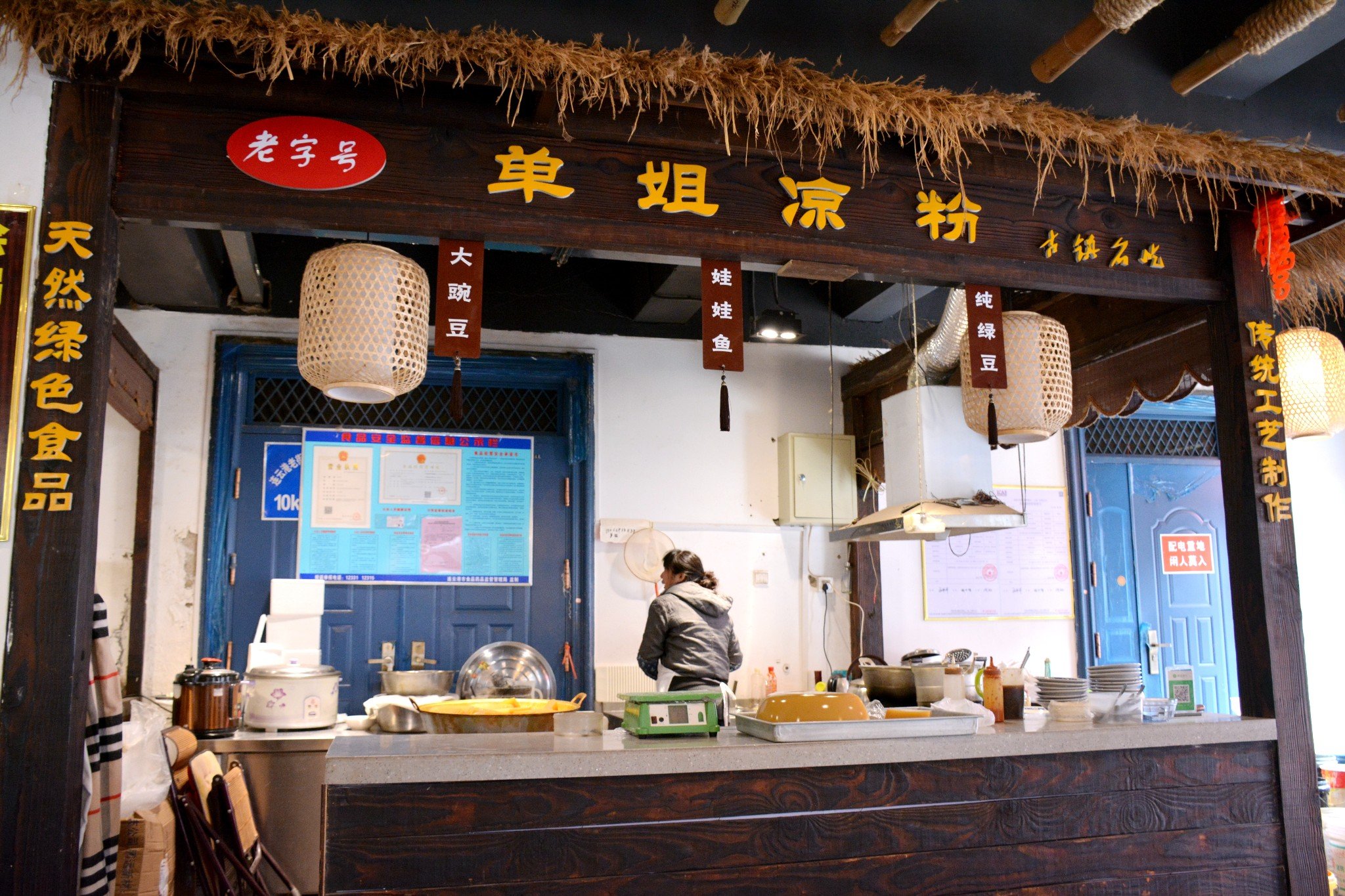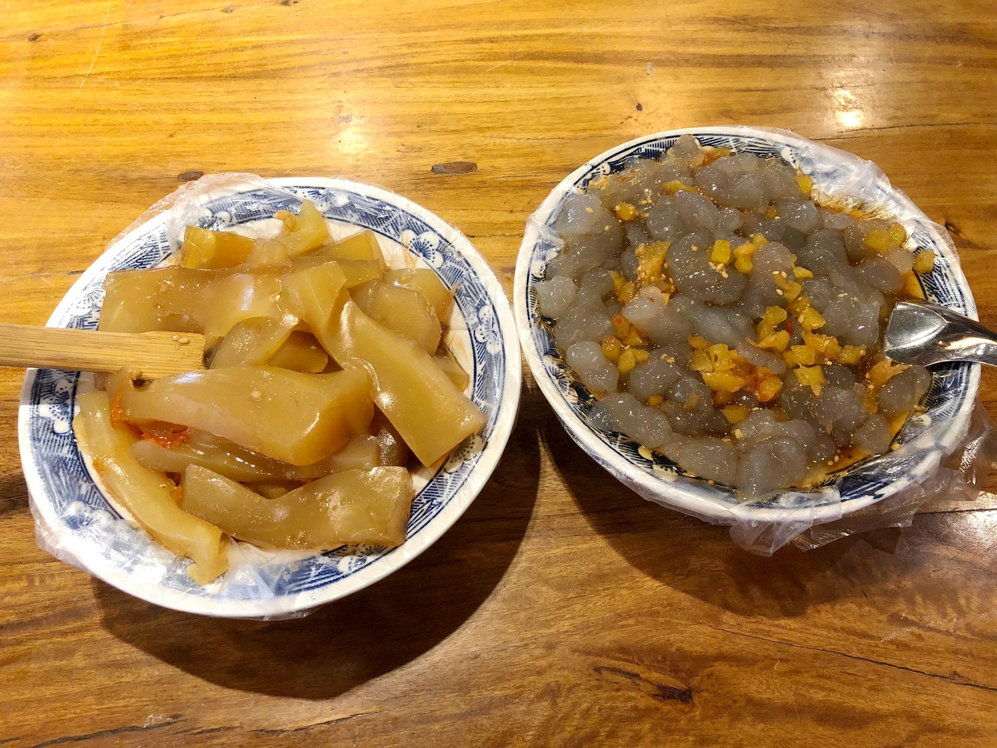 店里的灯笼、方桌长板凳颇有年代感。 当地人吃凉粉(豆类或山芋的淀粉,煮熟后冷凝成块,俗称“凉粉”),习惯在凉粉中加入板浦镇出名的汪恕有滴醋,搭配上蒜泥和辣椒,味道不言而喻。 【划重点】连云老街的“单姐凉粉“必点。 想让闺女配合照个相,但是凉粉上来后宝宝有点“控记不句她记几”一直问妈妈,“可以吃了么,可以吃了么。” 提起“娃娃鱼”和大家分享一下,位于墟沟街中韩商品城旁边的老字号“大松树娃娃鱼”,味道一级棒。