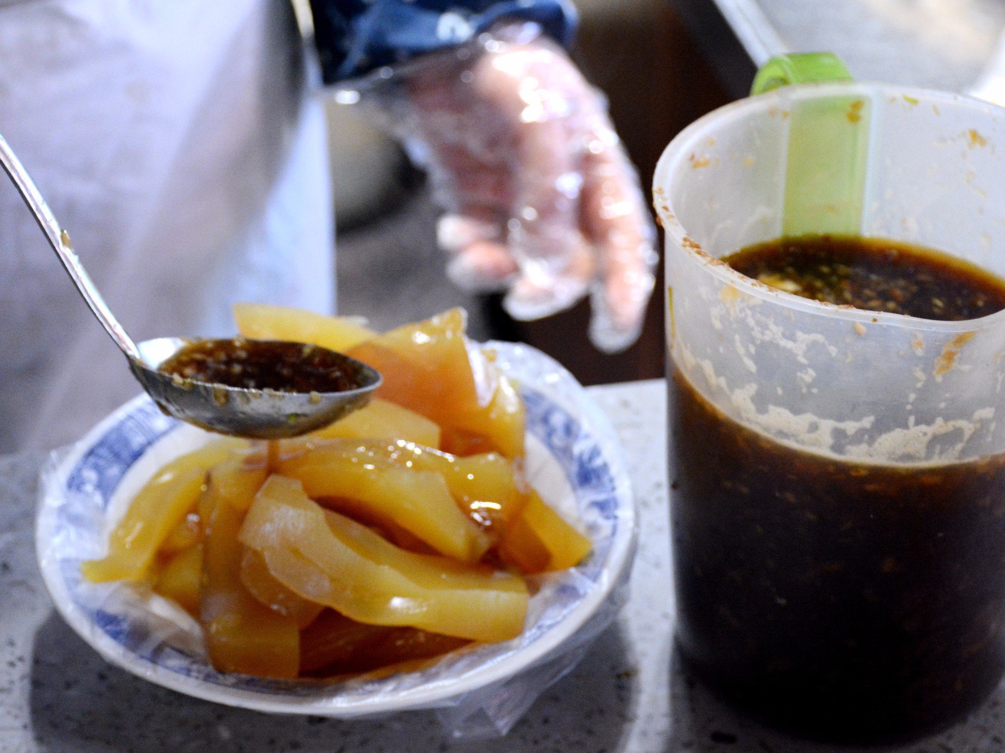 ↓↓↓ 连云港 的凉粉种类多,有豌豆粉、绿豆粉、山芋粉等。 凉粉的吃法一般有热吃、冷吃两种。热吃,是把凉粉放在烧热的平底油锅上,略煎一下,等底部有一层焦黄的皮后取出切块食用。当地人吃凉粉(豆类或山芋的淀粉,煮熟后冷凝成块,俗称“凉粉”),习惯在凉粉中加入本地板浦的汪恕有滴醋,搭配上蒜泥和辣椒,味道很赞