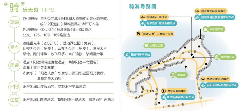 一、阳澄湖半岛骑行 骑行路线:阳澄湖大道——阳澄环路——重元寺——慈云路——莲池湖路——环湖自行车道——阳澄人家农家乐——奕欧来 位置:阳澄湖半岛旅游度假区环湖自行车道 交通:自驾到阳澄湖半岛星华街游客中心停好车,到一楼骑遇驿站租自行车 推荐理由:这里有"苏州首个环湖自行车步道",专业的骑行道骑着绝对爽快。这是苏州最具兼容并包精神的水泽半岛,千年古刹重元寺的宏伟钟声和欧美时尚潮流音乐互不相扰,极简的宗教禅意和奢华的生活享受巧妙融合,历史和潮流在这里都有迹可循,截然不同的范畴却能在这里相得益彰,和谐共生。沿途免费的仙樱湖公园、莲池湖公园、云杉湖公园,三大公园的景色足以让人驻足欣赏。 骑行装备:山地车、公路车、折叠车均可。车首灯或手电、车尾灯必带。要注意的是,骑行前要掌握必需的骑行技能,如刹闸、放坡等,放坡前一定细查车闸。