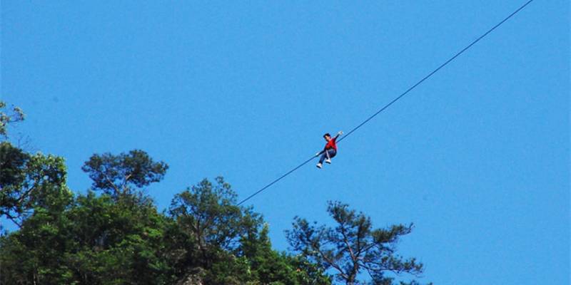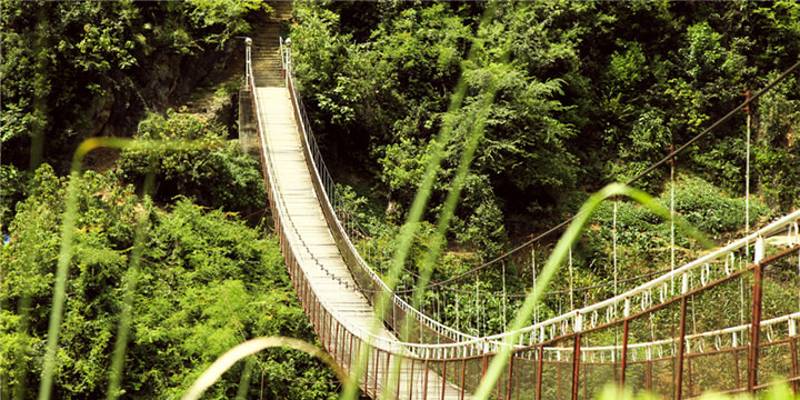 走完了云崖天廊还觉得意犹未尽?那就一定要试试位于同一景点的灵岩铁索桥啦。灵岩铁索桥“悬”在两座悬崖峭壁之间,桥长超过百米,桥下深不见底,游客行走于桥上时,桥身摇晃不定,胆小的旅客可能走到半路就腿软啦!当然,别光顾着低头走索桥啦,半空中的风景更美哦~