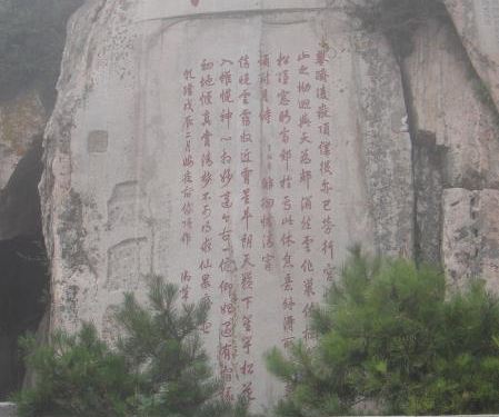 大观峰为泰山著名景点,位于玉皇顶前、平顶峰下,这里有一片立陡的山崖,上面布满了石刻