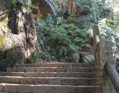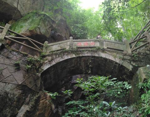 天桥在莫干山的剑池旁,和剑池浑然成一体,形成一个观赏整体,人们站在天桥欣赏剑池,拍拍照