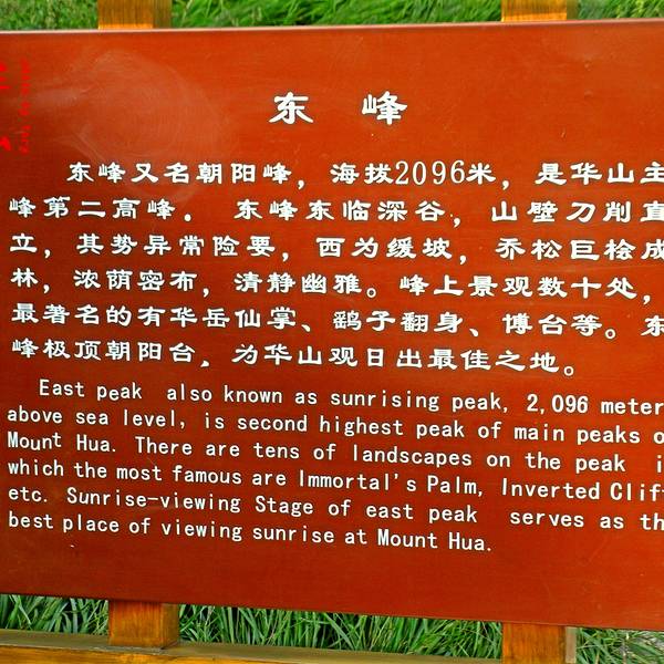 华山东峰由石楼峰、博台和朝阳台等几个峰头组成,其中朝阳台的海拔最高,这一平台居高临险,视野开阔,在东峰绝顶,是太阳最先照耀的地方,又是游人观赏华山日出的最佳位置,东峰也因之被称为朝阳峰。如到达东峰较早,在东峰观日台休息时建议租件大衣,山上租一件军大衣二十块,因东峰观日台临悬崖倚绝壁,看日出的人多,不要拥挤去占位。除了观日出之外,东峰景观也多,位于东石楼峰侧的崖壁上的华岳仙掌最为有名,还有青龙潭、甘露池、三茅洞、清虚洞、八景宫、太极东元门等。 展开