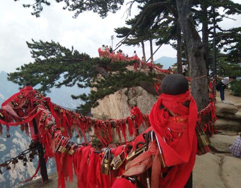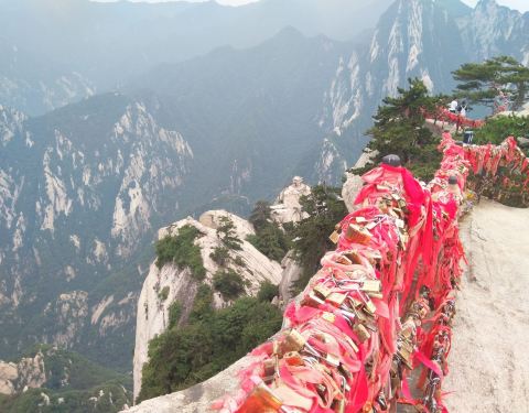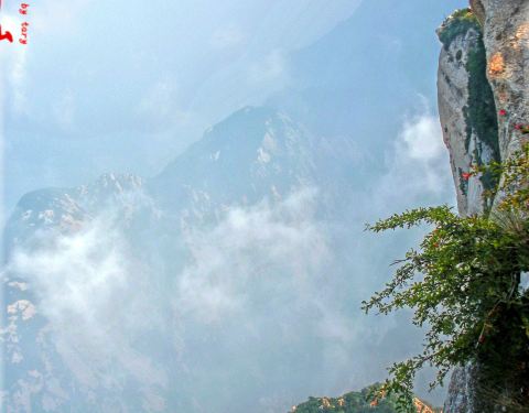 这是华山风景区中观看日出的最佳地方。 在鹞子翻身处,趴在接近90度的绝壁险道上,手拉着铁索慢慢挪动,感受命悬一线的刺激。