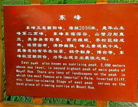 华山东峰,是华山主峰之一,这里是华山景区内观看日出很好的地方,所以也叫朝阳峰。东峰由石楼峰、博台和朝阳台等几个峰头组成,其中朝阳台的海拔高,居高临险,视野开阔,是观看日出的佳地点。每当红日升起,照耀周围许多如削如切的山峰,景色瑰丽。东峰(朝阳峰)还有不少小景观。位于石楼峰侧的崖壁上有天然石纹,象一巨型掌印,这就是关中的华岳仙掌;朝阳台北有杨公塔,为杨虎城将军所建;此外,东峰(朝阳峰)还有青龙潭、甘露池、三茅洞、清虚洞等。但很多景观因年代久远或天灾人祸而废,现仅存遗址。清虚洞附近有一座孤峰,峰顶上有铁瓦亭一座,铁棋一枰,据说是宋太祖赵匡胤曾在这里和陈抟老祖下棋,后因输棋,就将华山输给陈抟老祖,亭得名“下棋亭”。如果想去下棋亭,则必须经过鹞子翻身这一段绝壁险道,有恐高症或者胆小的游客,可以根据自身情况决定是否前往。华山的日出有“十日九不出”的说法,所以能看到日出的人,是非常幸运的。东峰(朝阳峰)游览完毕,可以继续游览南峰等华山景点。如果想去东峰(朝阳峰)看日出,那住宿在东峰(朝阳峰)景区是个不错的选择,这样早上可以多睡会。东峰饭店是距离东峰(朝阳峰)较近的住宿点,多人间床位费约150元(无独立洗手间,不能洗浴),标间要上千元。东峰(朝阳峰)附近也可以露营,如果你选择露营,注意安全和保暖,妥善处理垃圾很重要。如果你住在中峰,那需要起得稍早些,中峰到东峰(朝阳峰),约需1小时。