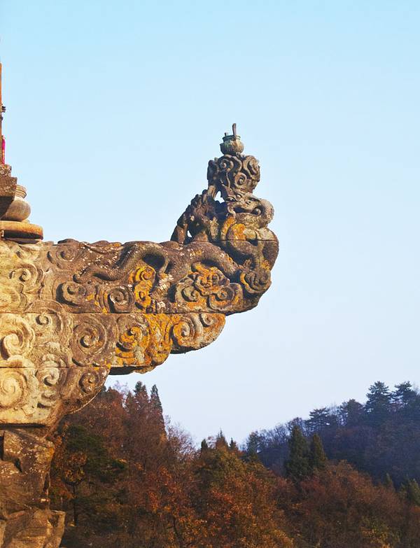 在南岩万寿宫外的绝崖旁,有一雕龙石梁,悬空伸出2.9米,宽约0.3米,上雕盘龙,龙头顶端雕一香炉,被称为“龙头香”。