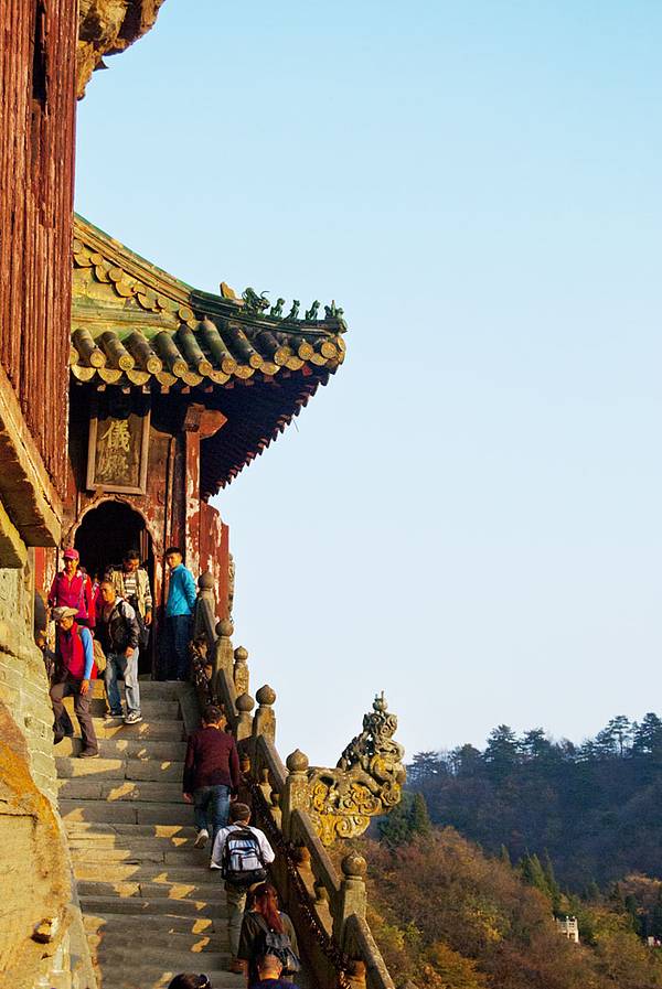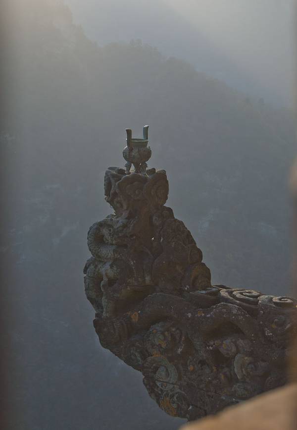 定下神前细看,那两条龙仰视吞噬着一团火球,跃跃欲飞,让人叹为观止。隔着窗栏反复欣赏,各角度拍照。由于也近傍晚,景区游人少,在两仪殿前过廊这样狭小的空间内仍可自如的欣赏、拍照,真是难得的机会。不知是以前为了点香有人摔下悬崖,还是今天不是什么大日子,龙头香上只有香炉而无点燃的香,少了许多灵气。整个南岩宫游览时间约1.5小时