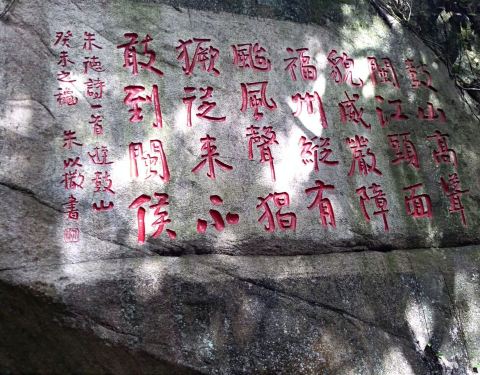 看上去在路旁的山间显得颇为的震撼鼓山是福州市民日常休闲的好去处 这里同样也汇聚了很多人文的景观 石刻的很多石头都写上了各式各样红色提字。看上去在路旁的山间显得颇为的震撼