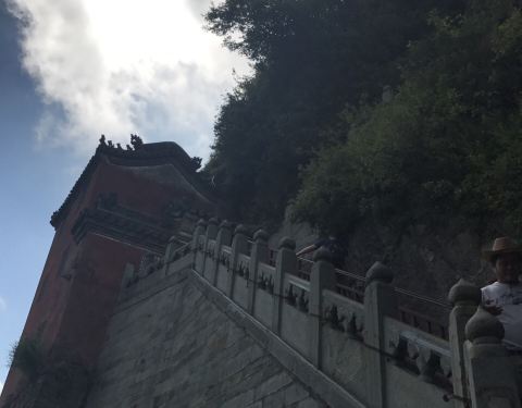 在武当山景区乘坐巴士再换乘缆车,即可直接到达武当山景区内的最高峰天柱峰。走下缆车后,沿山道步行一段距离就能登上天柱峰的山顶。登山过程中四下眺望,只见周围的大山层峦叠嶂,云雾缭绕,仿佛仙境一般。相比泰山的“一览众山小”,在武当山天柱峰上观赏众山,的确有此意境。