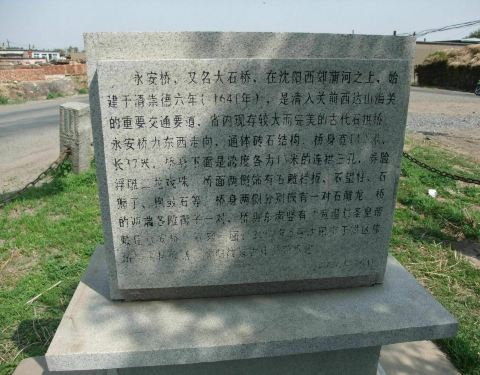 沈阳永安桥位于辽宁省沈阳市于洪区马三家子乡永安村,是一座石拱桥沈阳永安桥位于辽宁省沈阳市于洪区马三家子乡永安村,是一座石拱桥。永安桥清初,是当时清朝进,出沈阳的必经之地,位置十分重要,现为辽宁省级文物保护单位。