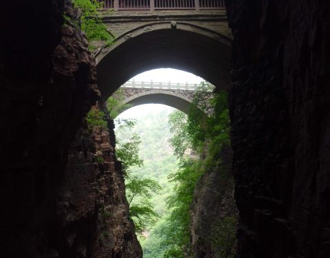 桥楼殿是苍岩山最有名的一座建筑。此殿是我国三大悬空寺之一,也是我国古代建筑的杰作桥楼殿是苍岩山最有名的一座建筑。只见在两壁断崖之上,凌空架有三座单孔石拱桥,桥上还建有楼殿,从山下仰望,桥楼凌空飞跨,云移楼动,恍然欲飞。此殿是我国三大悬空寺之一,也是我国古代建筑的杰作。