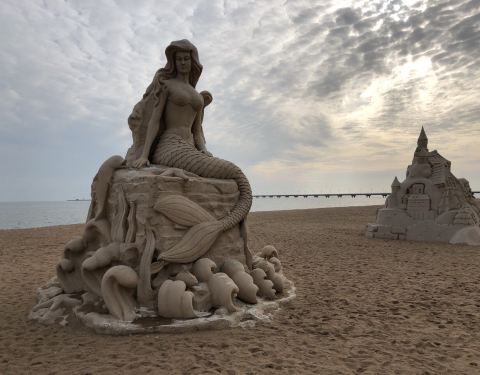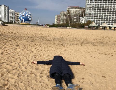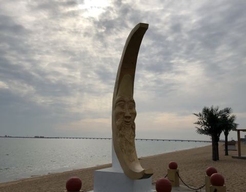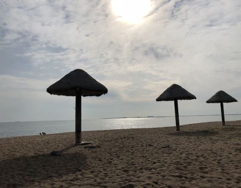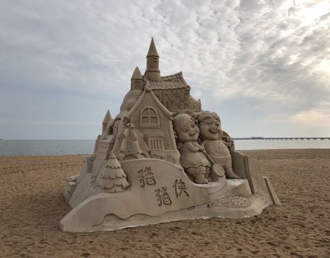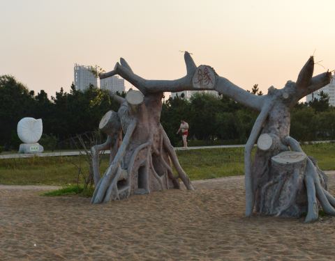 海阳万米沙滩位于海阳市最南端,分为三个部分:亚沙会场沙滩区、沙雕公园沙滩区和凤翔滩。亚沙会场沙滩区从连理大桥往西,水质清澈,但游客很少过去。沙雕公园沙滩区是万米沙滩的中间地带,从连理大桥往东,沙雕公园已经不收费了。相比于凤翔滩,沙雕公园沙滩区海水更蓝,沙子更细、更干净,浒苔更少,游客也更少,尤以连理大桥的桥头处最好,此处有免费停车场。这几张照片都是沙雕公园附近的。