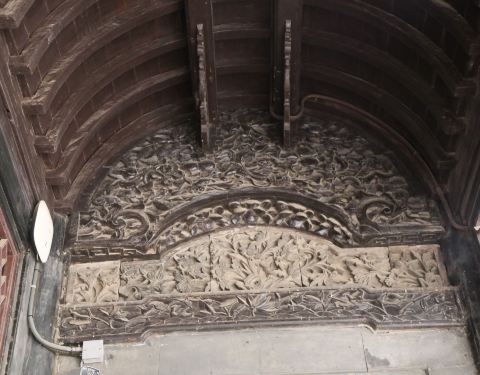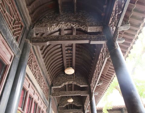 顶部是用细木构件榫接而成的螺旋是藻井,雕花工艺精美,在同类建筑中非常的少见在会馆的一角 还保留着当时的营业柜台