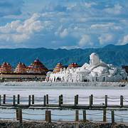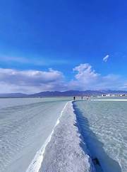 茶卡盐湖是一座有三千多年历史的盐场,湖水含盐量很大,会自然结晶成为一片白色的湖面,将天空、云朵和对岸的山都倒映在湖里,景色非常漂亮。游客还可以赤脚走到湖面上观看和拍摄自己的倒影,犹如天空之境。 茶卡盐湖在晴天时湖水结晶度很高,可以看到洁白的盐湖上覆盖一层薄薄的卤水,景色和倒影清晰又纯净。在景区雕塑区你可以看到石雕的盐湖守护女神,除了该雕塑外,其它约十几座巨大的雕塑都是盐雕,有弥勒佛、成吉思汗等造型。 沿着通道走到湖边,就可以看到洁白纯净的茶卡盐湖,尽情游玩。湖中间有一条铁路延伸至湖内,起点处便是乘坐小火车的地方,可以乘车前往湖内深处,那里的景色更为纯净。