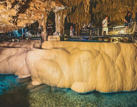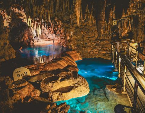 日本第一美的钟乳石洞,冲绳玉泉洞 位在冲绳世界文化王国内的玉泉洞是冲绳南部的著名景点,在日本被称为第一美的钟乳石洞。全长为5000米长的钟乳石洞为日本第二长的地下洞窟(洞窟有850米是对外开放参观)。在30万年漫长的岁月中形成的钟乳石洞,你可以在洞内亲眼见证时光所刻划的钟乳石成长历程。钟乳石洞位在地底下,所以一开始要沿着阶梯往地底走。这里冬暖夏凉,终年均温21度,但是潮湿了点,地上永远是湿哒哒的,走起路来要小心滑倒。洞里的人气景点青之泉搭配水里打出的蓝光,让这边有着神祕的感觉,虽然它有点是后天的人为加工。玉泉洞的参观时间大概在30到40分钟之间,结束后可搭配王国村体验冲绳文化。
